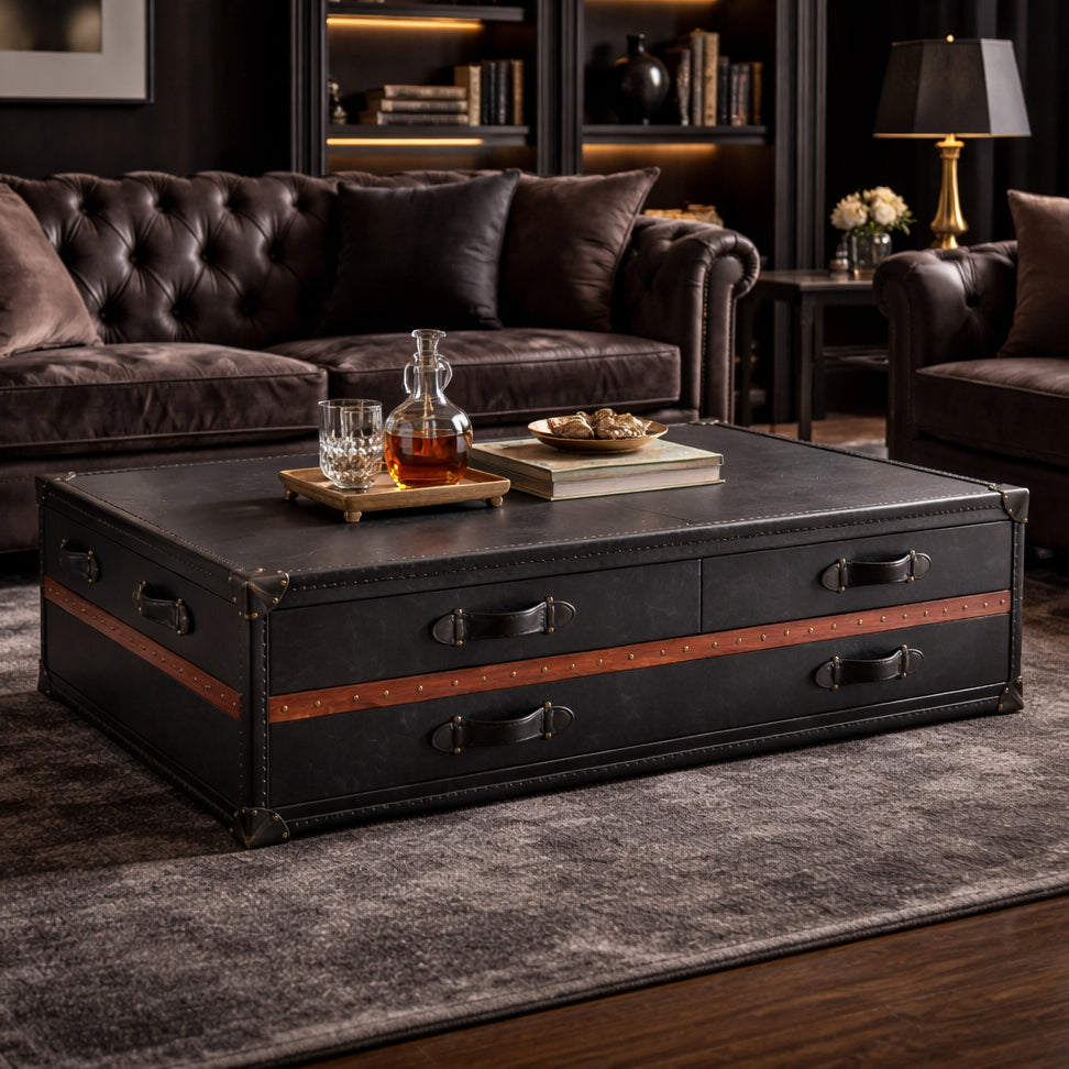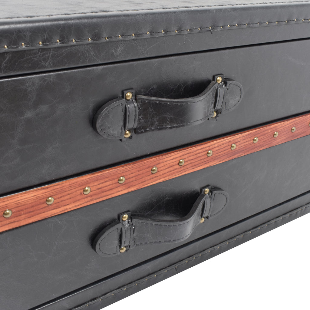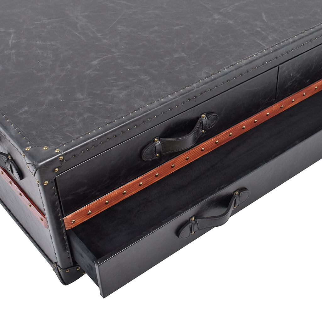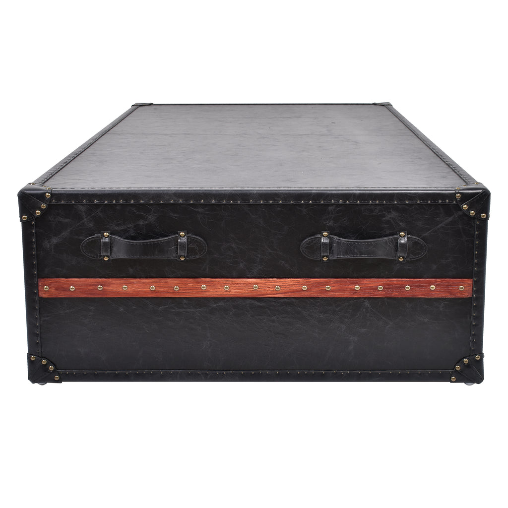 This item is upholstered in distressed black leather. We utilize only the best cuts of South American, top grain cowhide. The leather has been hand-worked to give it a vintage look and feel. Each piece will have its own characteristics and be completely unique. Our leather is designed to age beautifully with time. For more information about caring for our leather products, check out our Care Instructions.