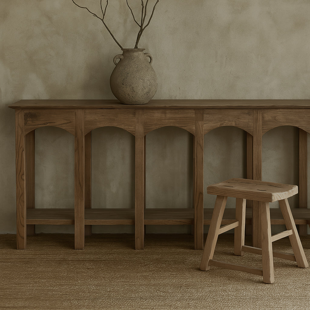 The Thornton Old Elm Hall Table is crafted from recycled elm timber, this striking console table features a long, narrow silhouette with distinctive arched detailing along the front. The open base design adds a sense of lightness while highlighting the natural grain and character of the reclaimed wood. Perfect for an entryway or behind a sofa, this piece blends rustic charm with architectural elegance.
