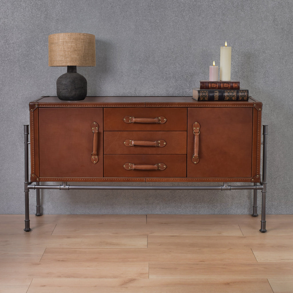 The Carter Vintage Leather Buffet is a stunning piece that combines timeless elegance with rugged craftsmanship. Upholstered in rich, top-grain cowhide, it features intricate stud detailing along the edges and corners, enhancing its vintage appeal. With two cupboards and three storage drawers, all adorned with leather handles, it offers both style and functionality. Supported by a sturdy iron frame, this buffet showcases an industrial-inspired touch that complements its warm leather exterior, making it a versatile and distinctive addition to any space.