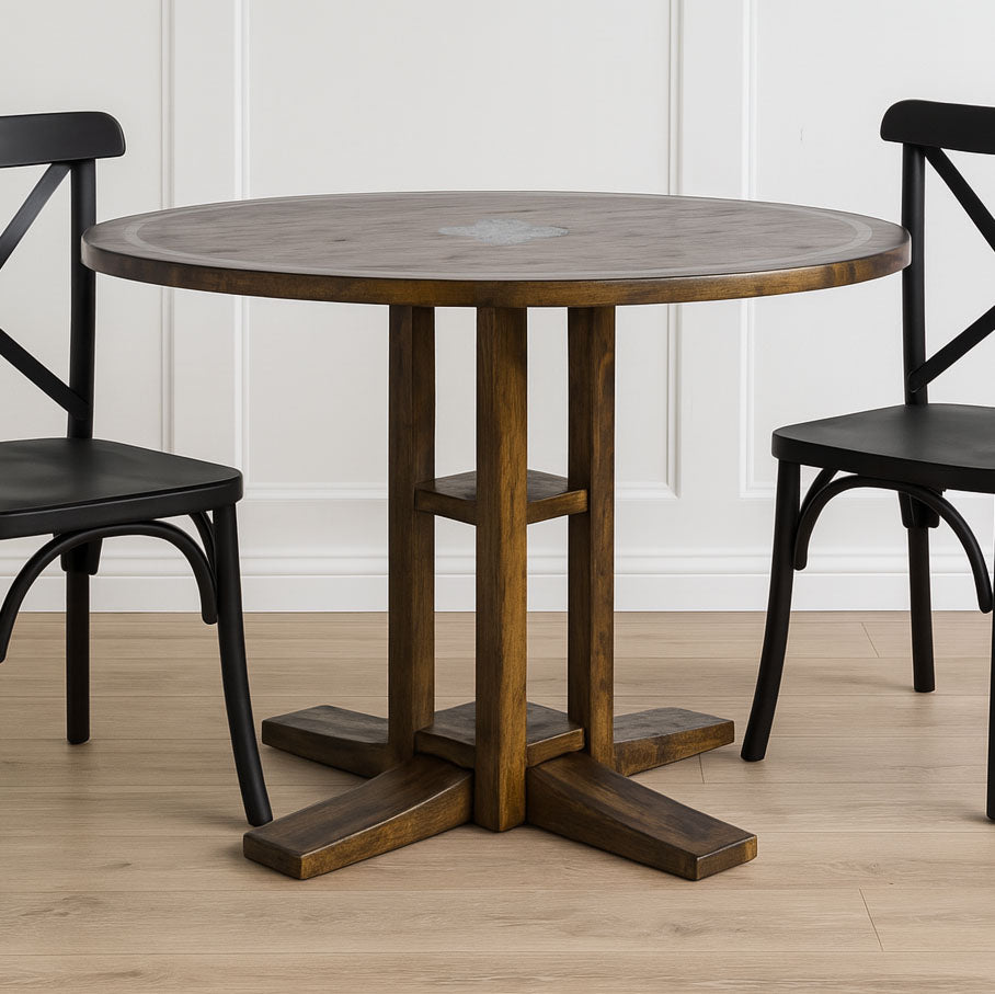 The Dublin 120cm Round Dining Table is a stunning piece of furniture crafted from solid Indonesian mango wood, known for its durability and rich grain patterns. This table features an intricate clover inlay and trim detail on the top, adding a touch of elegance and sophistication to its design. Finished in our beautiful Albany Brown with a triple coat lacquer, the table boasts a rich, glossy surface that enhances its natural wood grain while providing added protection and durability.