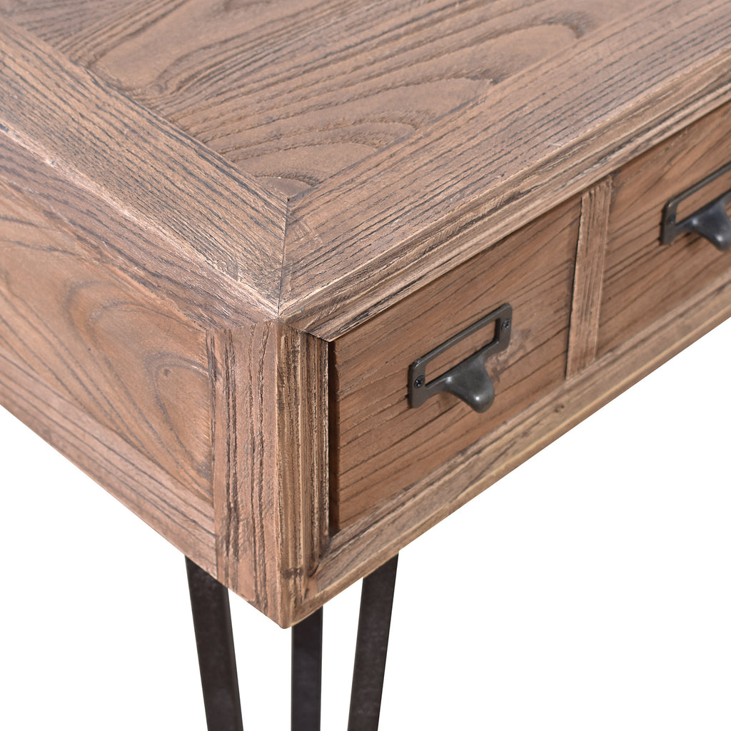 The Apothecary Old Elm Desk seamlessly blends rustic elegance with modern functionality, crafted from recycled elm timber with a rich, weathered finish. Its design is highlighted by three spacious drawers adorned with apothecary-style handles, providing both storage and vintage charm. The desk is elevated on textured iron hairpin legs, adding an industrial touch to its timeless appeal. Perfect for a home office, study, or creative workspace, this desk offers both style and practicality in a compact and versatile design.