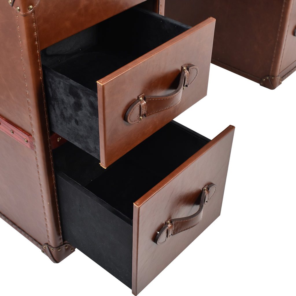 The Lancaster Vintage Leather Trunk Desk is a distinctive statement piece that blends heritage-inspired design with everyday practicality. Featuring trunk-style double leg bases, each side incorporates one deep drawer and one shallower drawer, all lined with black velvet and finished with leather pull handles for a refined touch. A central drawer beneath the desktop adds extra storage for essentials, keeping the workspace clean and organised.
