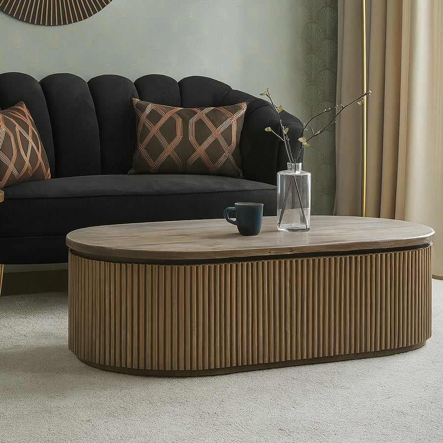 The Celine Old Elm Coffee Table brings warmth and texture to any living space with its refined, organic form and artisanal detailing. Crafted from reclaimed old elm timber, the table features a gently rounded oval top that highlights the natural grain and aged character of the wood. Its ribbed base adds depth and dimension, creating a sculptural presence that balances rustic charm with contemporary design. Perfect for grounding a lounge setting, the Celine is both functional and visually striking—an elegant centrepiece with timeless appeal.