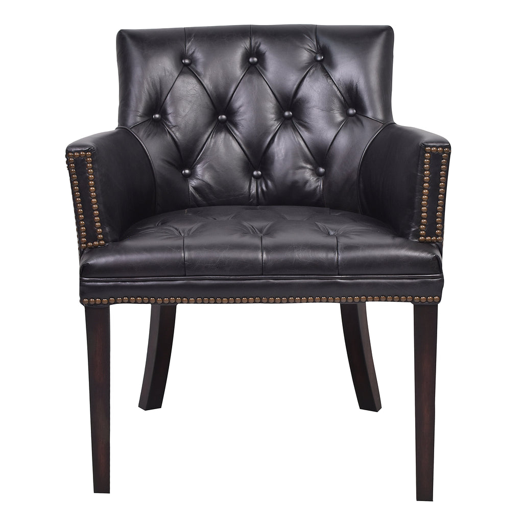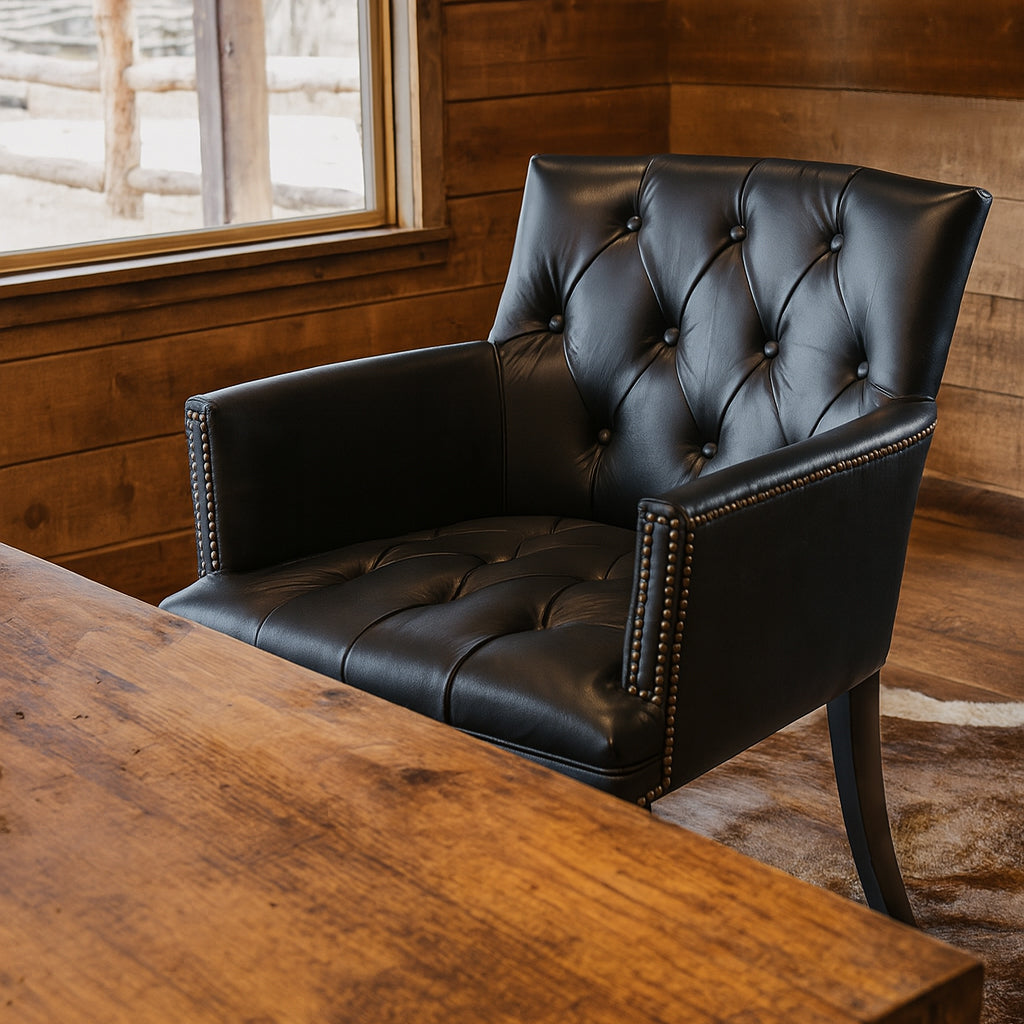 The Stafford Dining Chair is a masterpiece of both style and comfort, designed to elevate any dining or living space with its distinctive features. Upholstered in luxurious distressed black top grain cowhide leather, this carver-shaped chair exudes an air of timeless sophistication. The brass stud trim adorning the arms adds a touch of elegance, while tufted buttons on the seat and backrest provide a classic and inviting appeal.