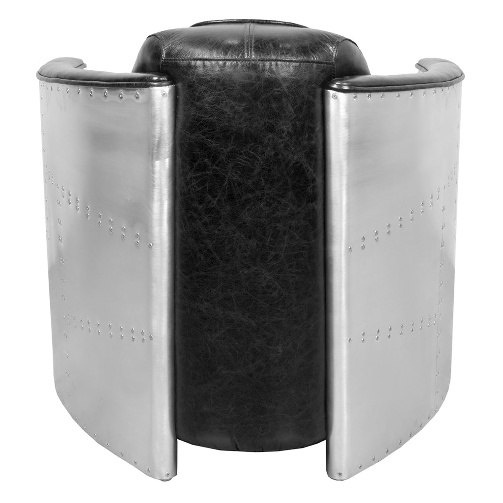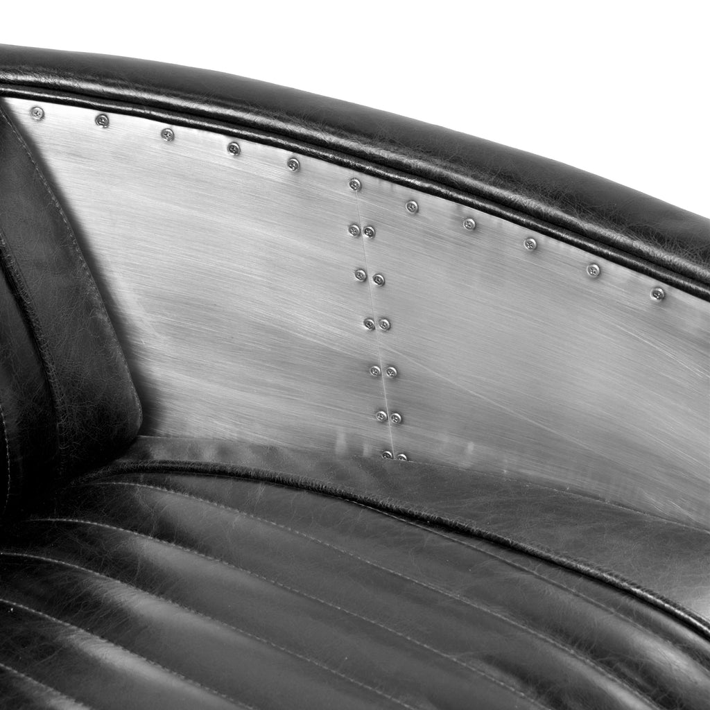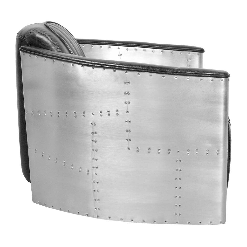 The Vulcan Vintage Black Armchair is a bold statement piece inspired by classic aviator design and the rugged beauty of early aircraft. Featuring striking curved aluminium arms with steel rivet detailing, it delivers an industrial edge balanced by refined craftsmanship. The seat and back cushions showcase distinctive aviator-style stitching, echoing the heritage of vintage flight seating, while offering a firm yet supportive sit with quality foam-filled cushioning.