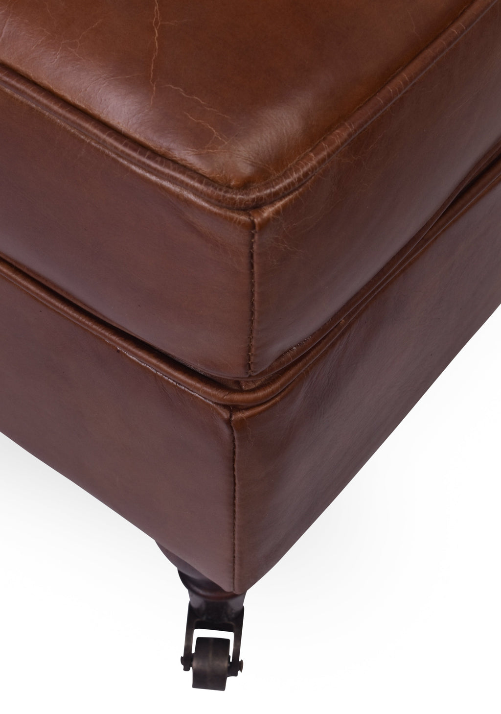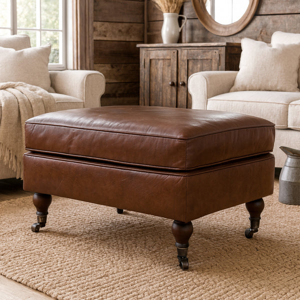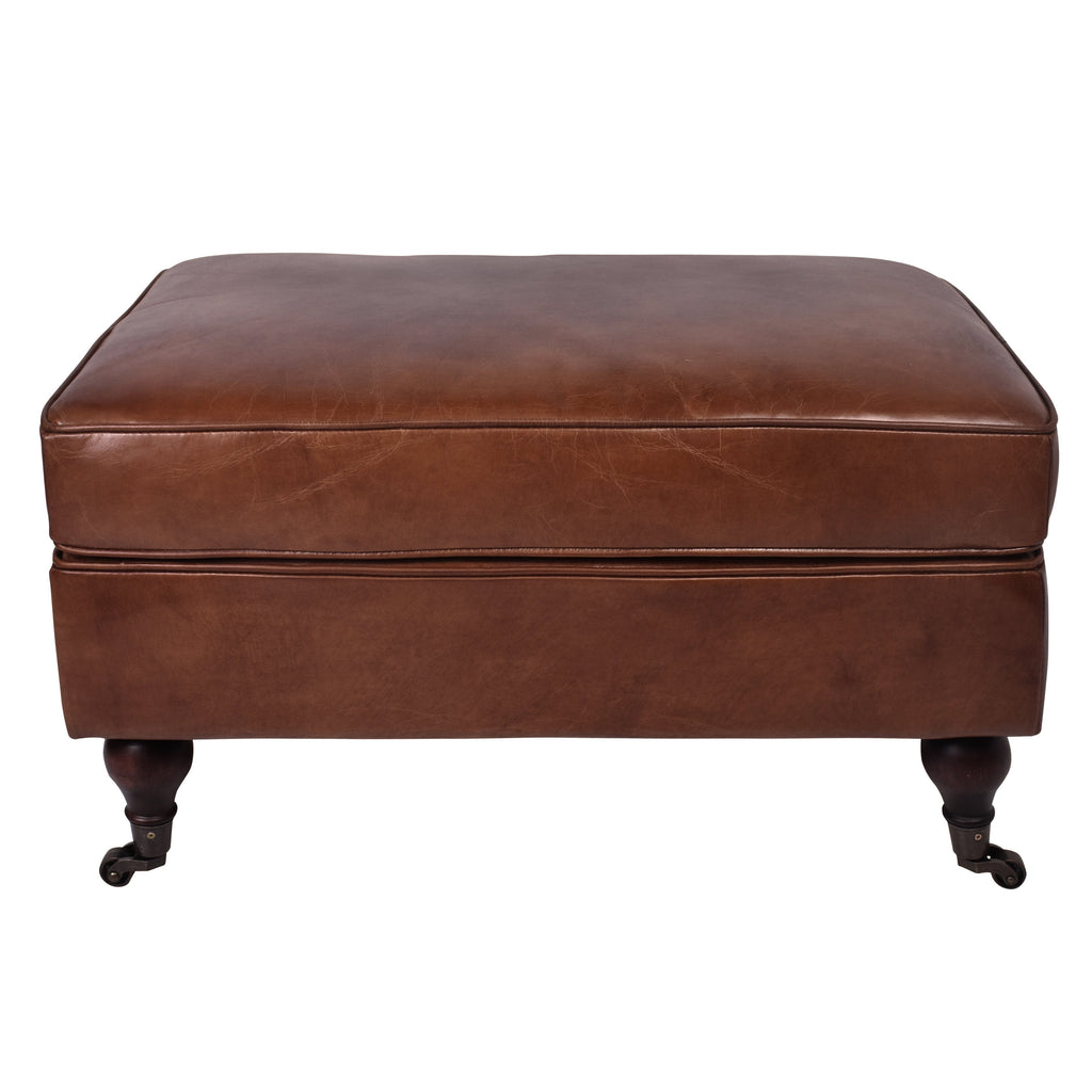 The Chiswick Vintage Leather Ottoman is upholstered in top grain leather. The leather has been aged by hand to give it a beautiful, vintage look and feel. This ottoman is big enough to sit your feet on or even for somewhere to sit. The Chiswick is supported by four antique style castor wheel feet. These make it easier for movement and add to the antique look.