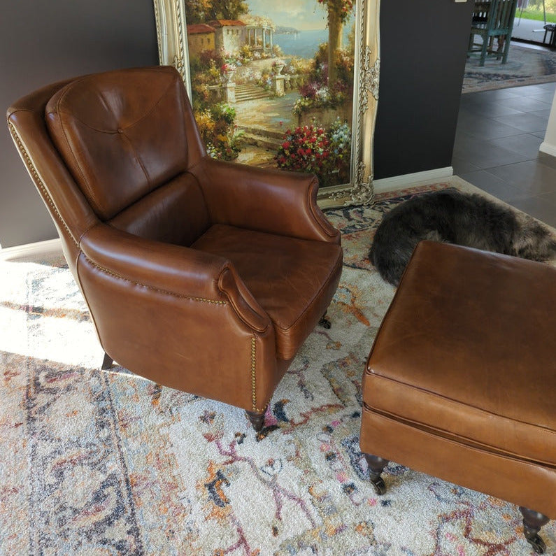 The cushion has a high-density foam / feather fill. Built with a solid timber frame. This piece is one to be treasured from one generation to the next. Looking for more leather furniture? Shop our range of Leather Armchairs, Leather Sofas, and Leather Footstools to add to your space.
