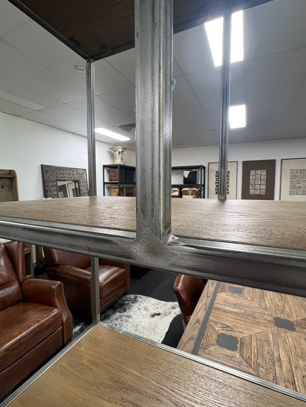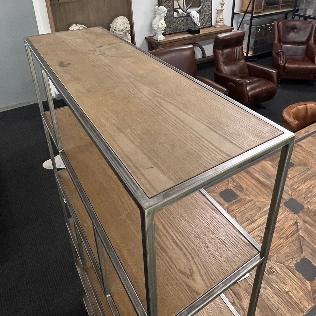 Industrial inspired shelf made with sleek ash veneer & forged iron supports.