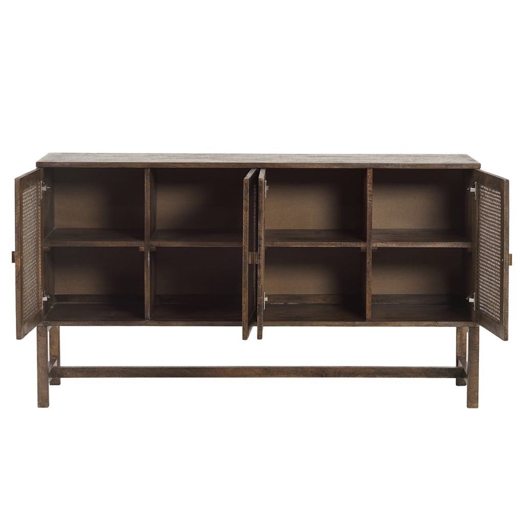 The Avoca Birdeye Sideboard in Honey Brown offers a refined balance of warmth and texture, crafted from Indonesian mango wood in a deep honey brown finish that highlights its natural grain. At 160cm in length, it provides ample storage through four door sections, each opening to a shelved interior ideal for organising dining or living essentials. The doors are finished with rustic metal handles and rattan webbing panels, introducing an organic, tactile element that complements its relaxed, vintage-inspired aesthetic while remaining versatile across a range of interiors.