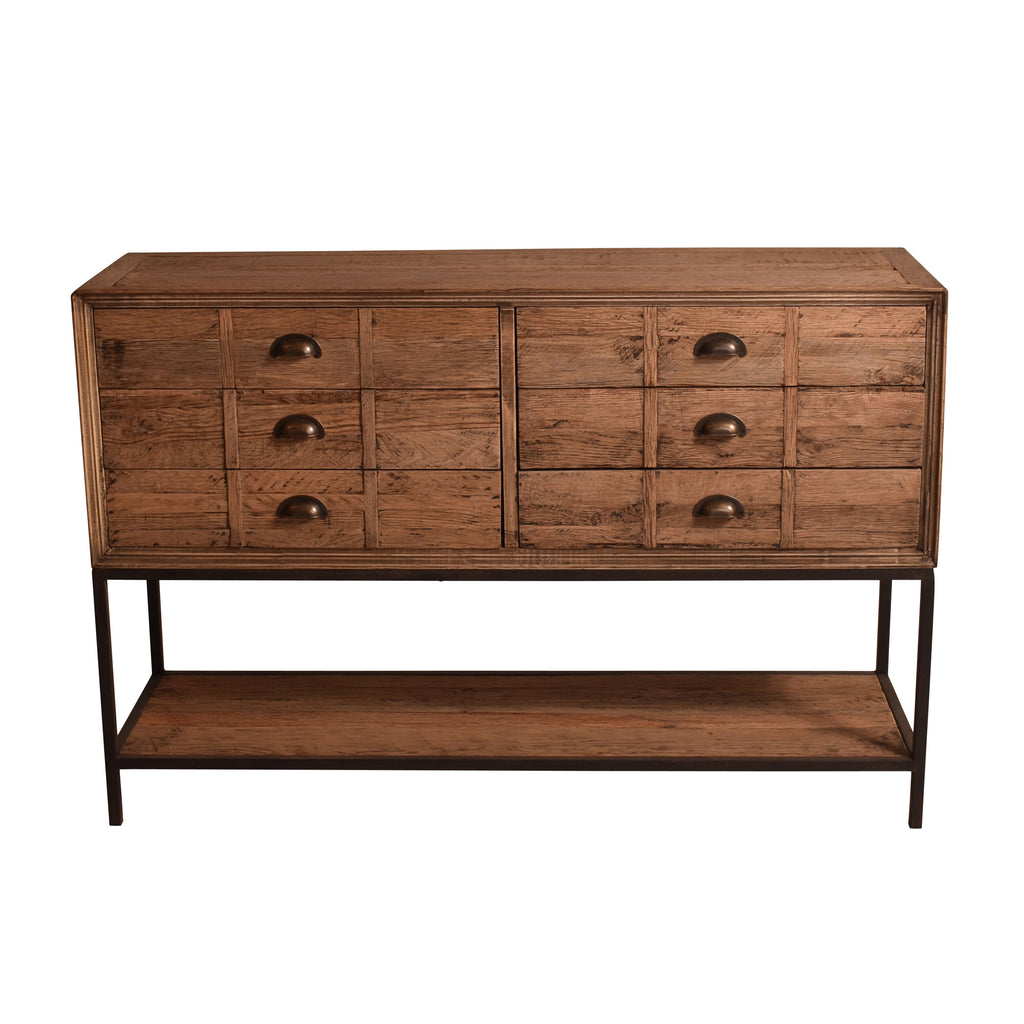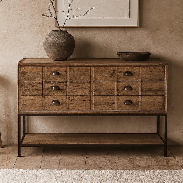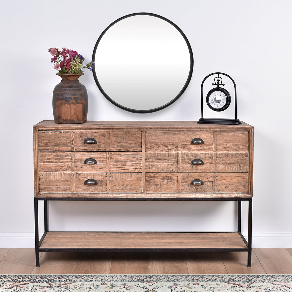 The Captain's Recycled Timber Sideboard is an exquisite piece crafted from recycled oak timber, combining classic elegance with practical functionality. This sideboard features six spacious storage drawers, each adorned with an antique sea shell handle, adding a touch of vintage charm. Below the drawers, an open shelf provides additional storage or display space, perfect for showcasing decorative items. The frame is constructed from rustic textured iron, giving the piece a sturdy and industrial feel. The Captain's Recycled Timber Sideboard seamlessly blends style and utility, making it a standout addition to any room.