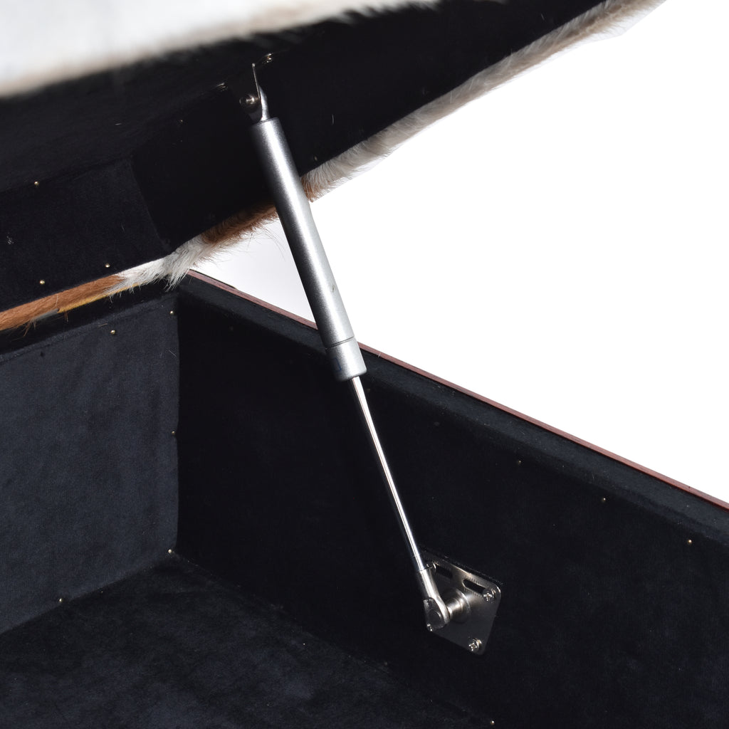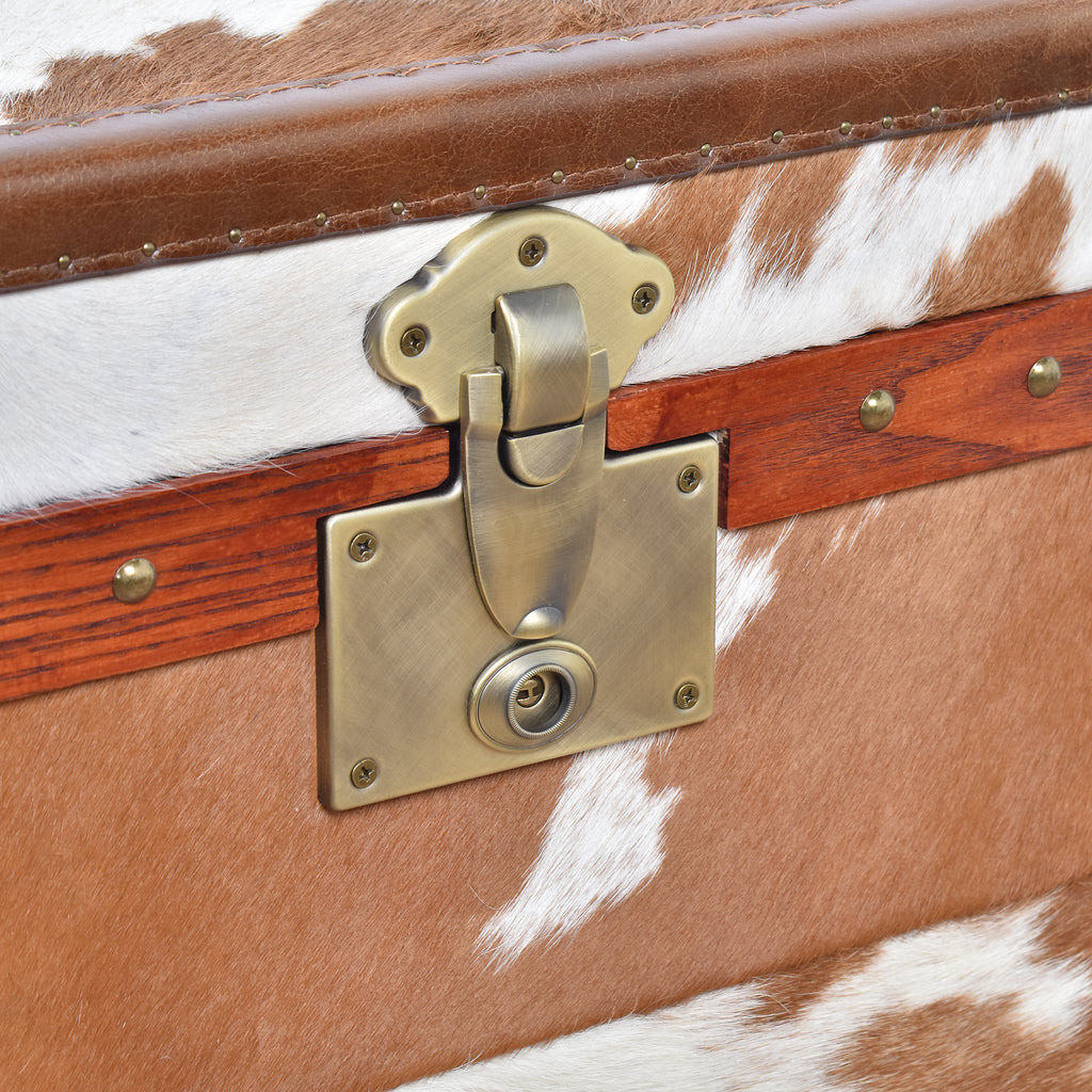 The Nomad Brown Cowhide Trunk Side Table is a distinctive accent piece that blends bold character with practical storage. Upholstered in genuine Hereford cowhide, each piece features its own unique patterning and natural colour variation, ensuring no two are exactly alike. A flip-top lid opens smoothly with gas lift assistance to reveal a velvet-lined internal storage compartment, ideal for keeping everyday items neatly tucked away.