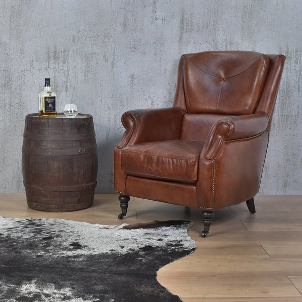 This item is upholstered in our signature, hand aged leather. We utilize only the best cuts of South American, top grain cowhide. The leather is dyed using natural, semi aniline dyes. Each piece has been hand-worked to give it a vintage look and feel. This includes signs of age like cracking and distressing. Every item will have its own characteristics and markings, making it unique. As this leather is hand-made, some colour variation can occur between pieces. Our leather is designed to age beautifully with time. For more information about caring for our leather products, Read Our New Blog: How to Care for Vintage Leather