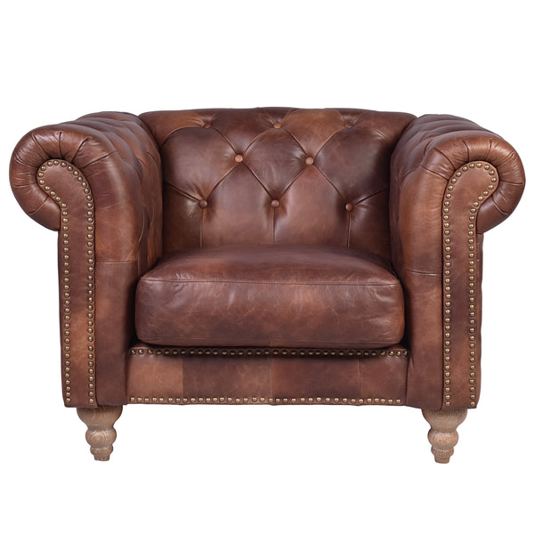 The GG Leather Chesterfield Armchair is a classically styled Chesterfield armchair, combining vintage style with modern comfort. Featuring rolled arms and deep buttoning on the arms and back. Upholstered in premium top grain cowhide. The leather is distressed and waxed for a soft and comfortable feel. Completed with a brass stud trim and cherry wood timber feet. The seat cushions are soft and extra thick. The back rest is a medium firmness with good back support.