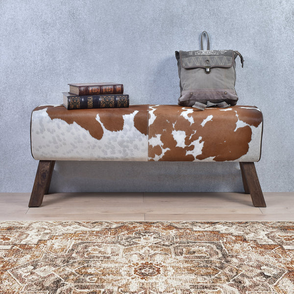 Each piece of cowhide is unique, exhibiting its own distinctive markings and textures, ensuring that no two benches are alike. The cowhide upholstery adds a touch of rustic charm, while the four solid timber feet provide stability and strength to the overall structure.