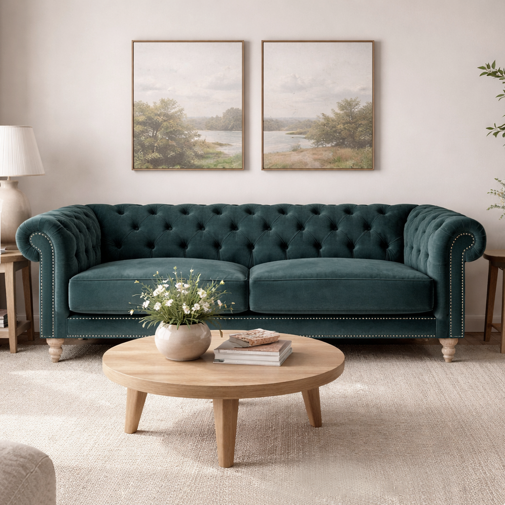 Built with a solid timber frame to last the test of time. The feet are constructed from solid Birch wood. Birch is a beautiful, hardwood timber known for having an impressive strength and durability. You can be assured that the Libera 3 Seater Green Velvet Chesterfield Sofa is constructed from the best quality materials and is a piece to be passed down from one generation to the next.