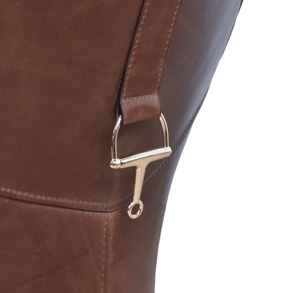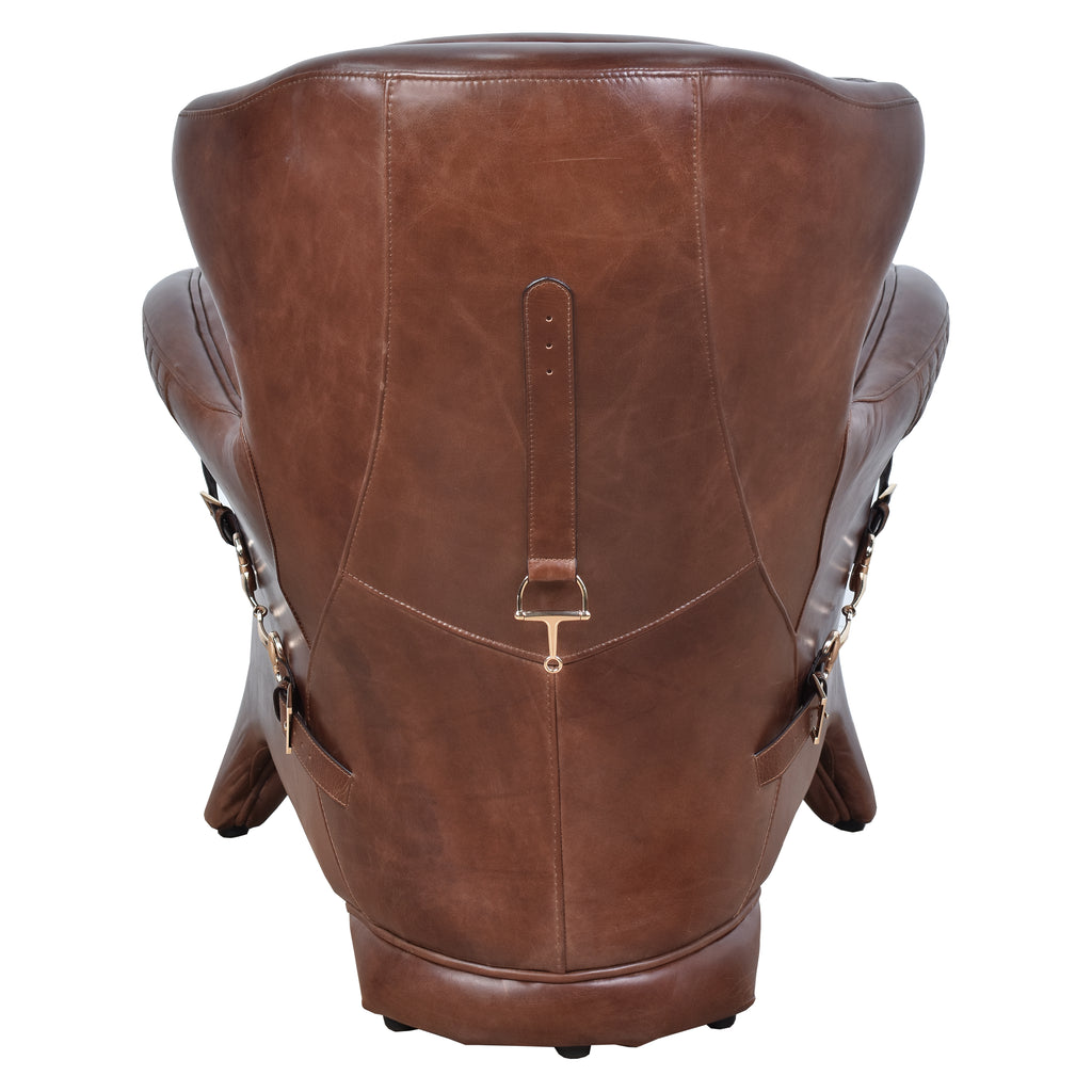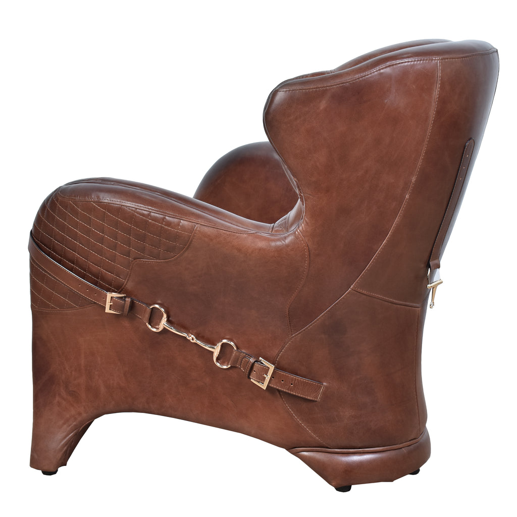 The Stallion Full Leather Armchair is a striking tribute to the design of a leather horse saddle, combining equestrian inspiration with contemporary comfort. Upholstered in rich, top-grain cowhide leather with cross-stitch detailing enhancing the chair’s craftsmanship, while the soft cushion and medium-firm backrest, both filled with high-density foam, provide exceptional comfort for hours of lounging. Accentuated by leather buckle detailing on each side and a decorative stirrup adorning the backrest, this armchair is a unique statement piece that effortlessly blends style with functional elegance.